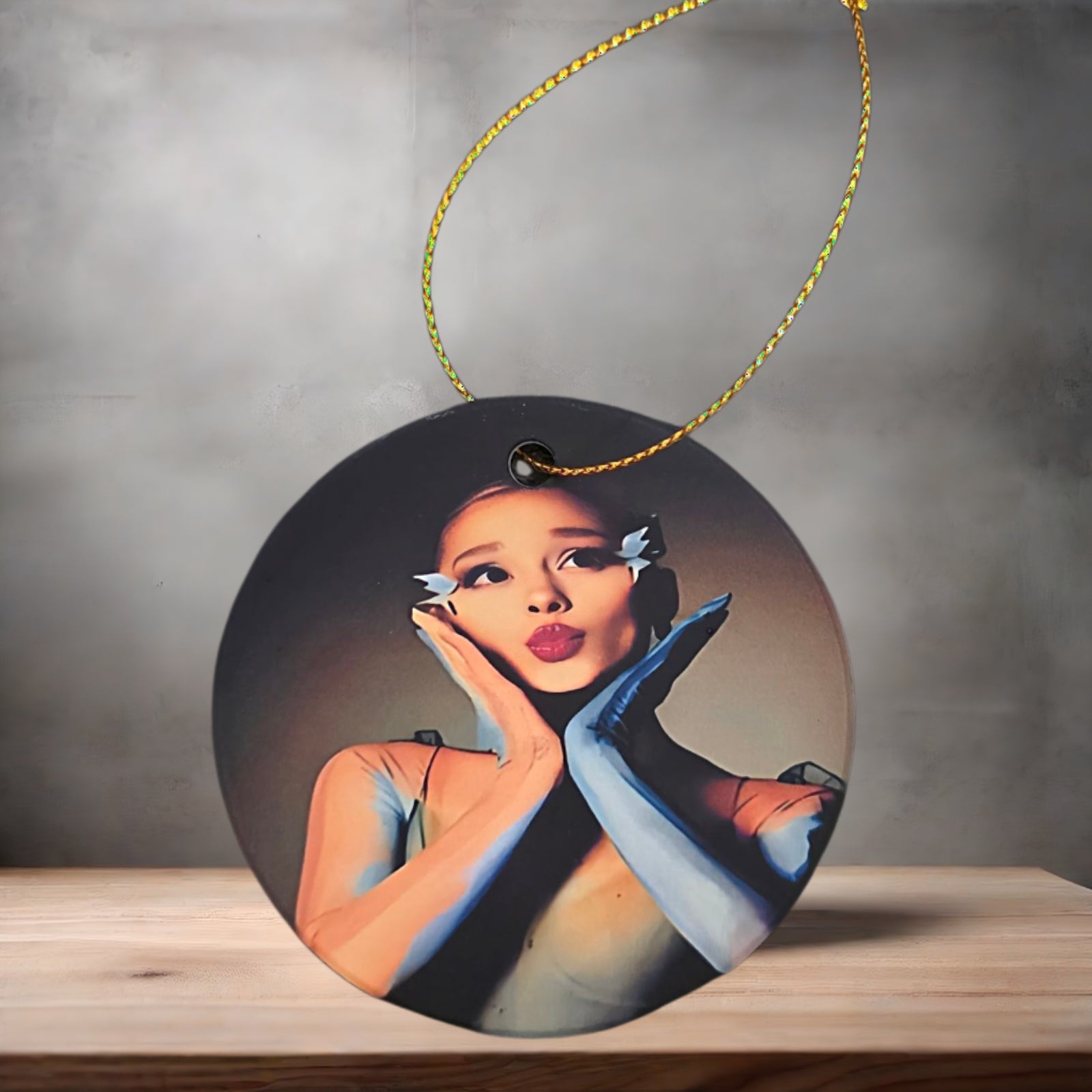 Christmas ornament , 3" round ceramic. Ariana Grande