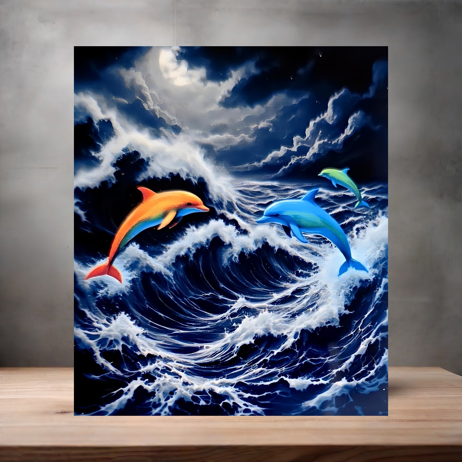 Colorful jumping dolphin poster on aluminum print. Multiple sizes available