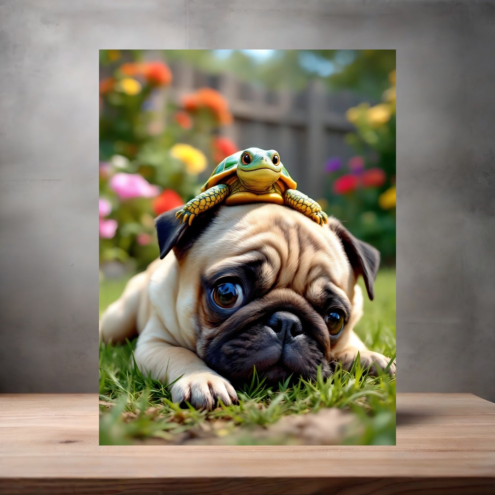 Pug Puppy with turtle poster on aluminum print. Multiple sizes available