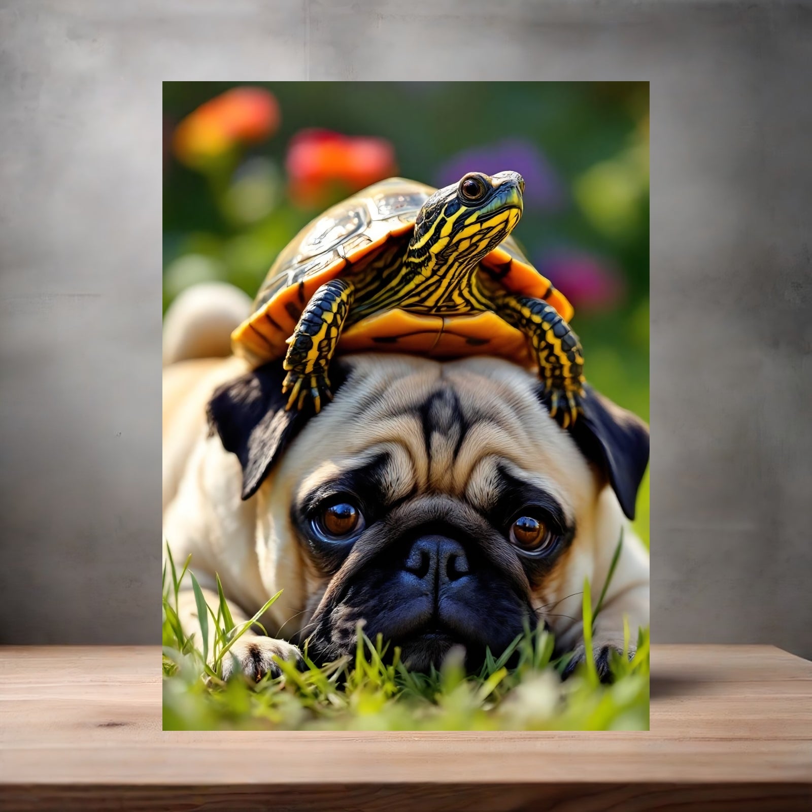 Pug with turtle poster on aluminum print. Multiple sizes available