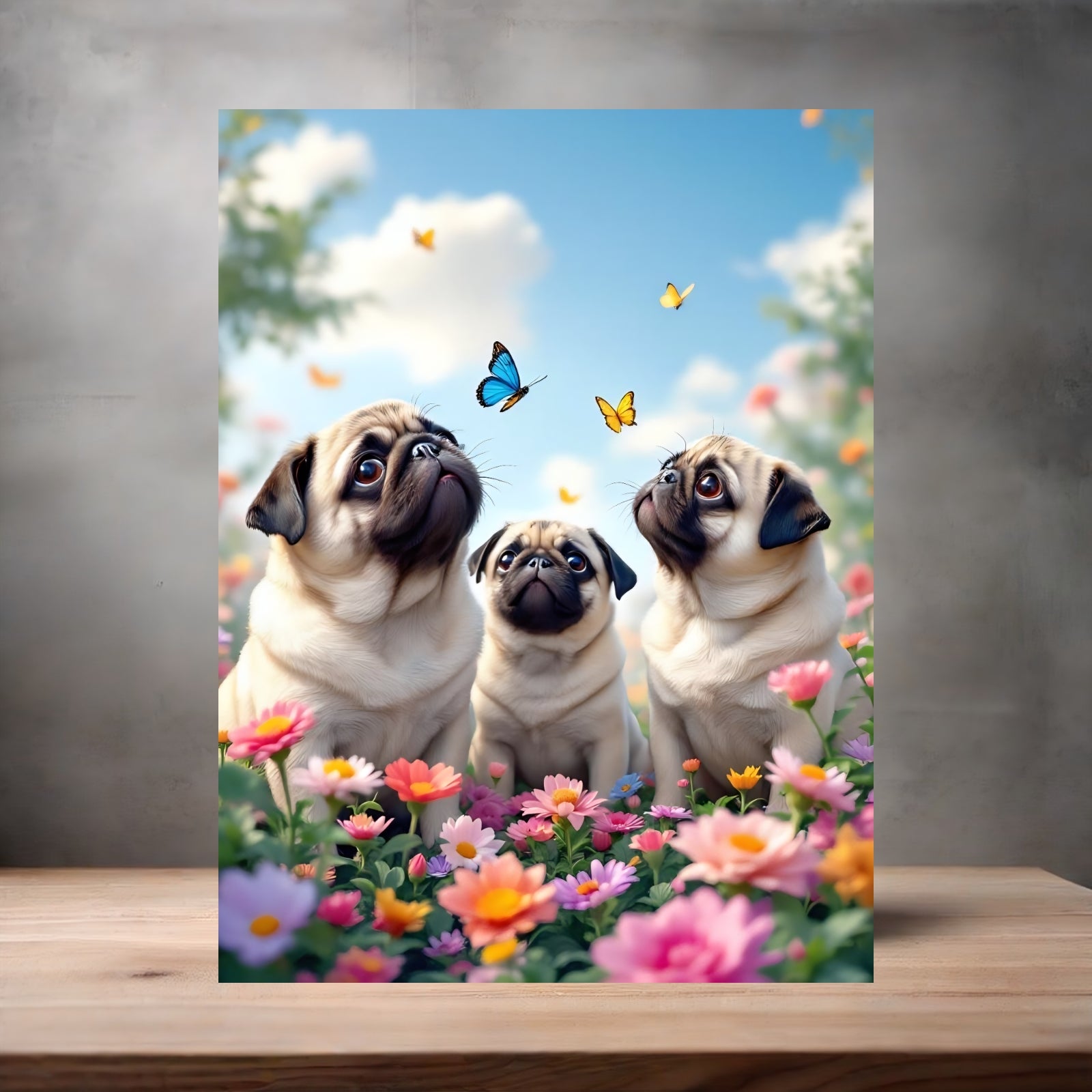 Pugs chasing butterflies poster on aluminum print. Multiple sizes available
