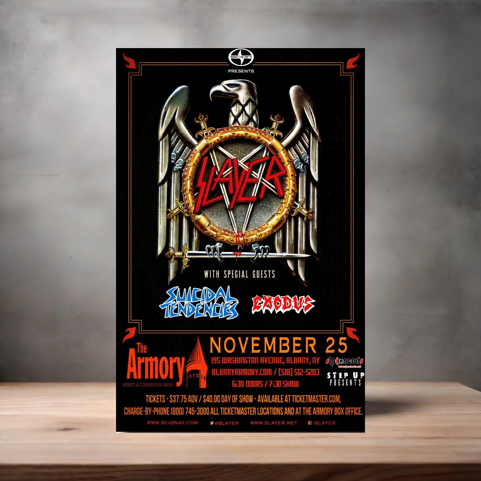 "Display your love for metal with this Slayer rock poster on a sleek aluminum print. Available in multiple sizes, this durable print captures the intensity of the band's live performances. Perfect for any music lover looking to add a touch of edge to their home decor."