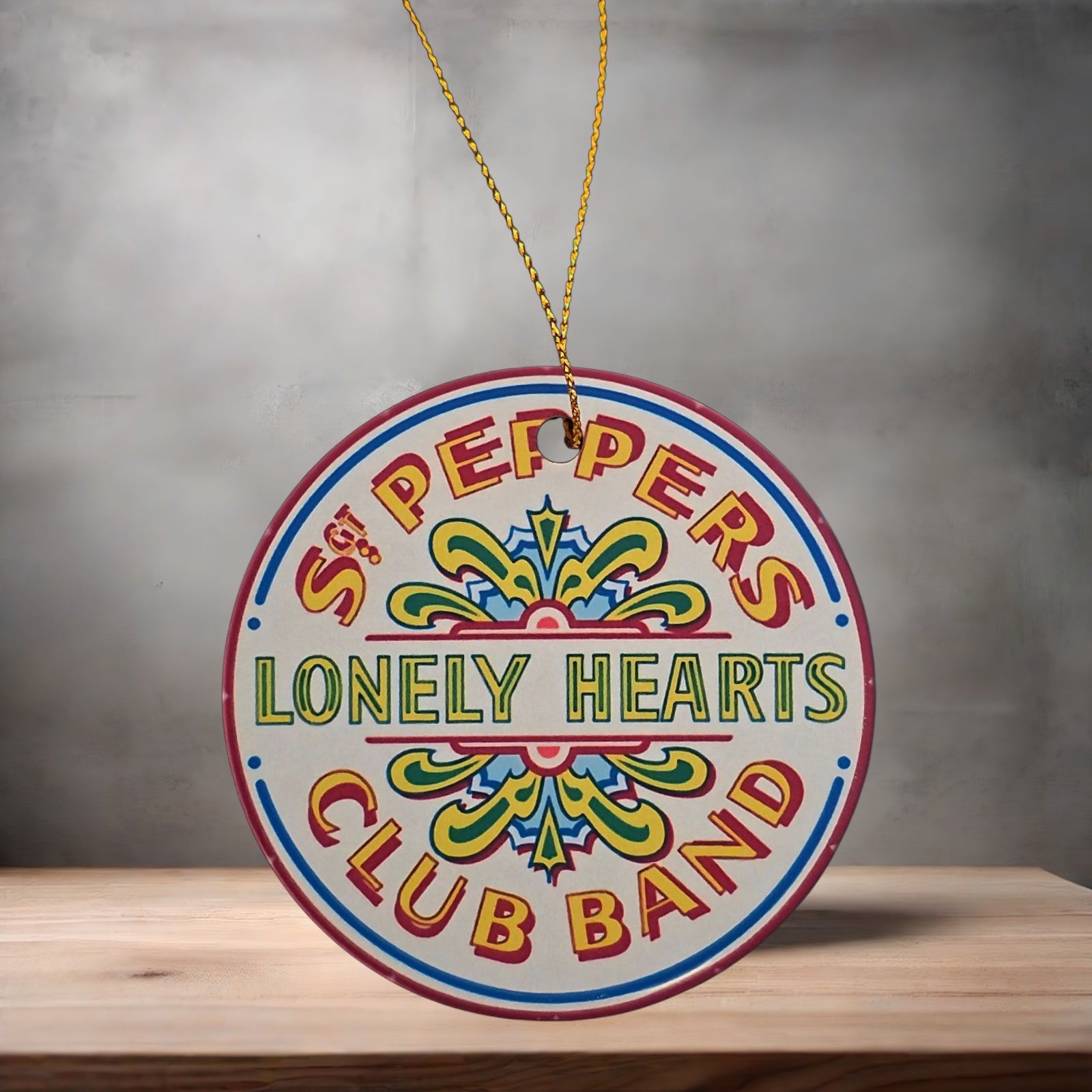 The Beatles Sgt Peppers Lonely Hearts Club band Christmas ornament , 3" round ceramic.