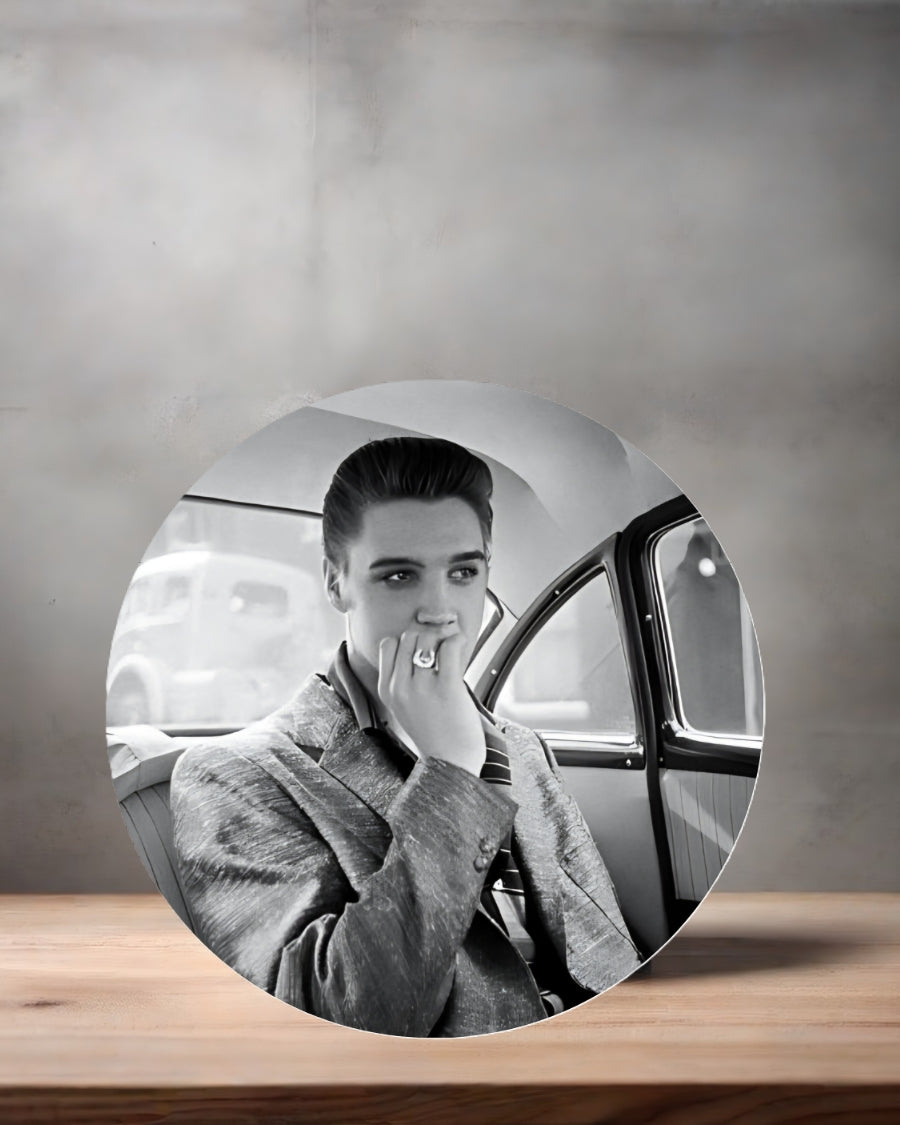 Elvis Presley Christmas ornament , 3" round ceramic. v14
