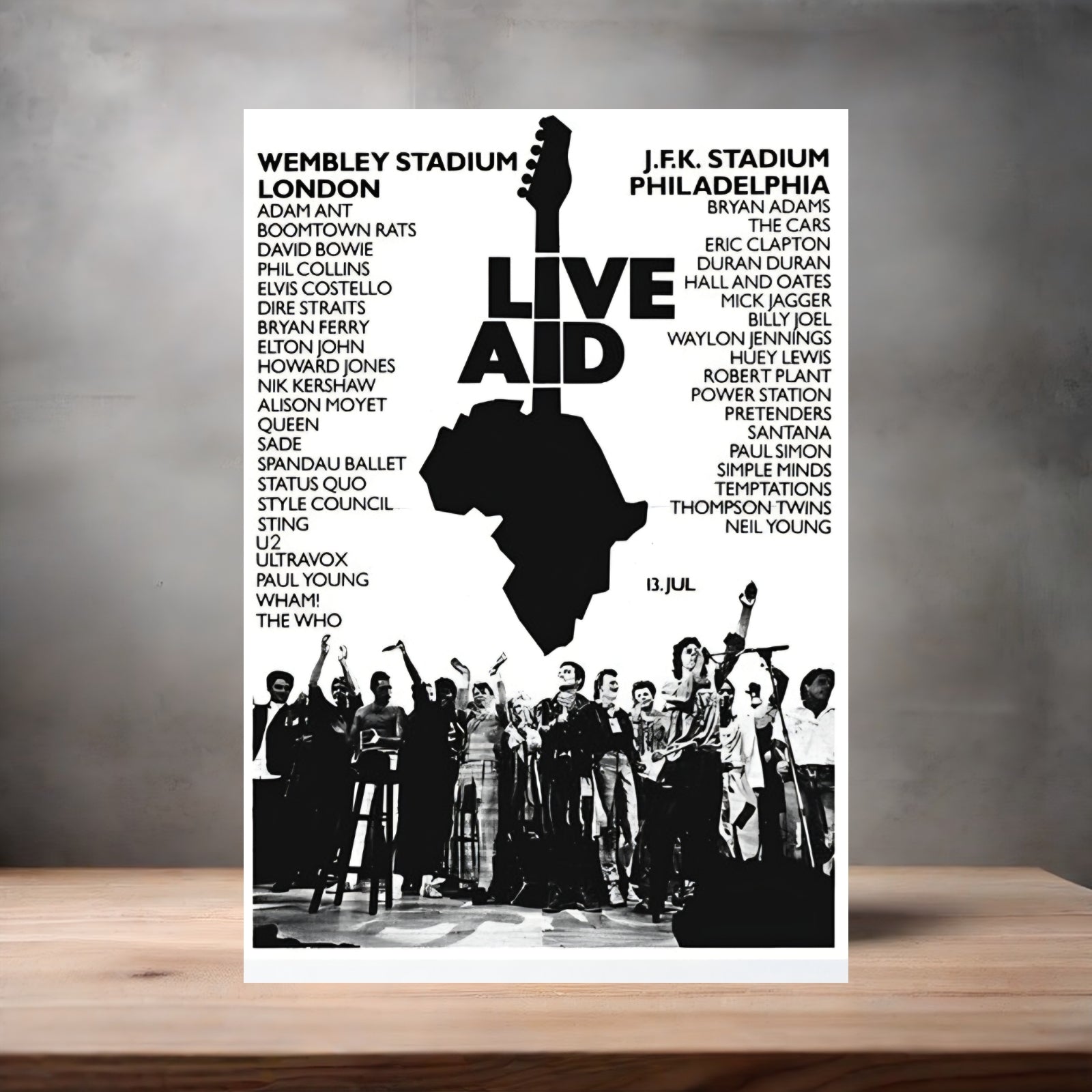 Capture the historic spirit of the 1985 Live Aid concert with this expertly crafted aluminum print. Featuring vibrant, long-lasting colors and a sleek finish, this poster commemorates one of the most significant music events in history. Available in multiple sizes, it offers a durable and elegant display option for collectors and music enthusiasts seeking to honor this landmark performance.