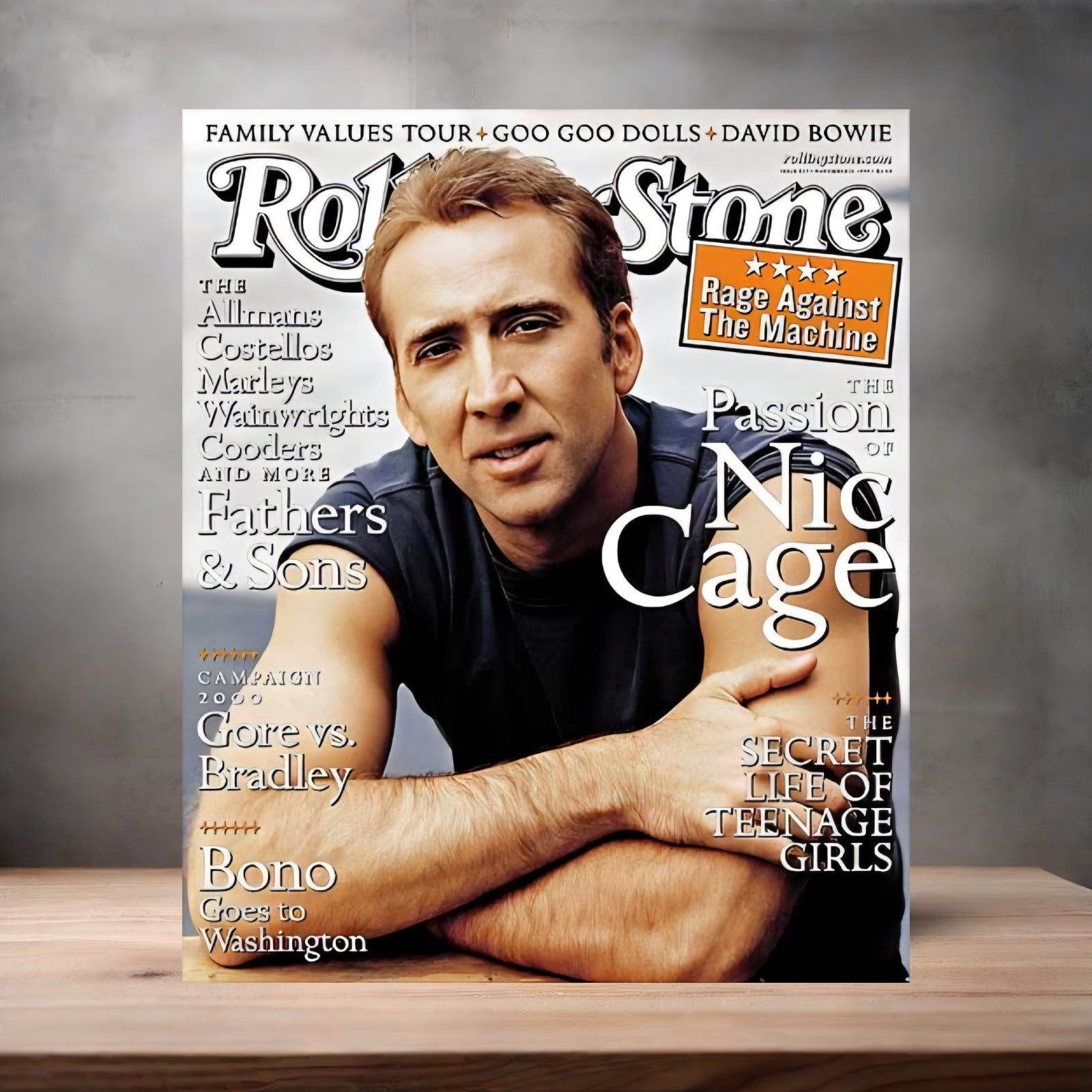 Nic Cage Rolling Stone magazine poster on aluminum print. Multiple sizes available