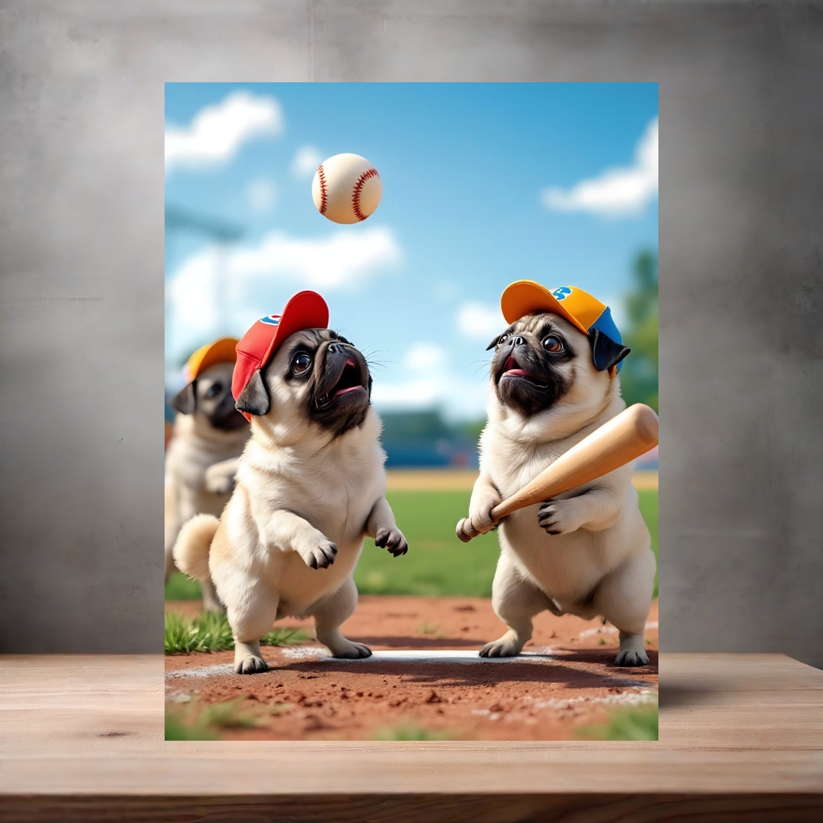 This aluminum print features an adorable depiction of pugs playing baseball. Available in multiple sizes, this unique poster is sure to add a playful touch to any room. Made with high-quality materials, it promises to bring joy and charm to any pug or baseball fan's space.