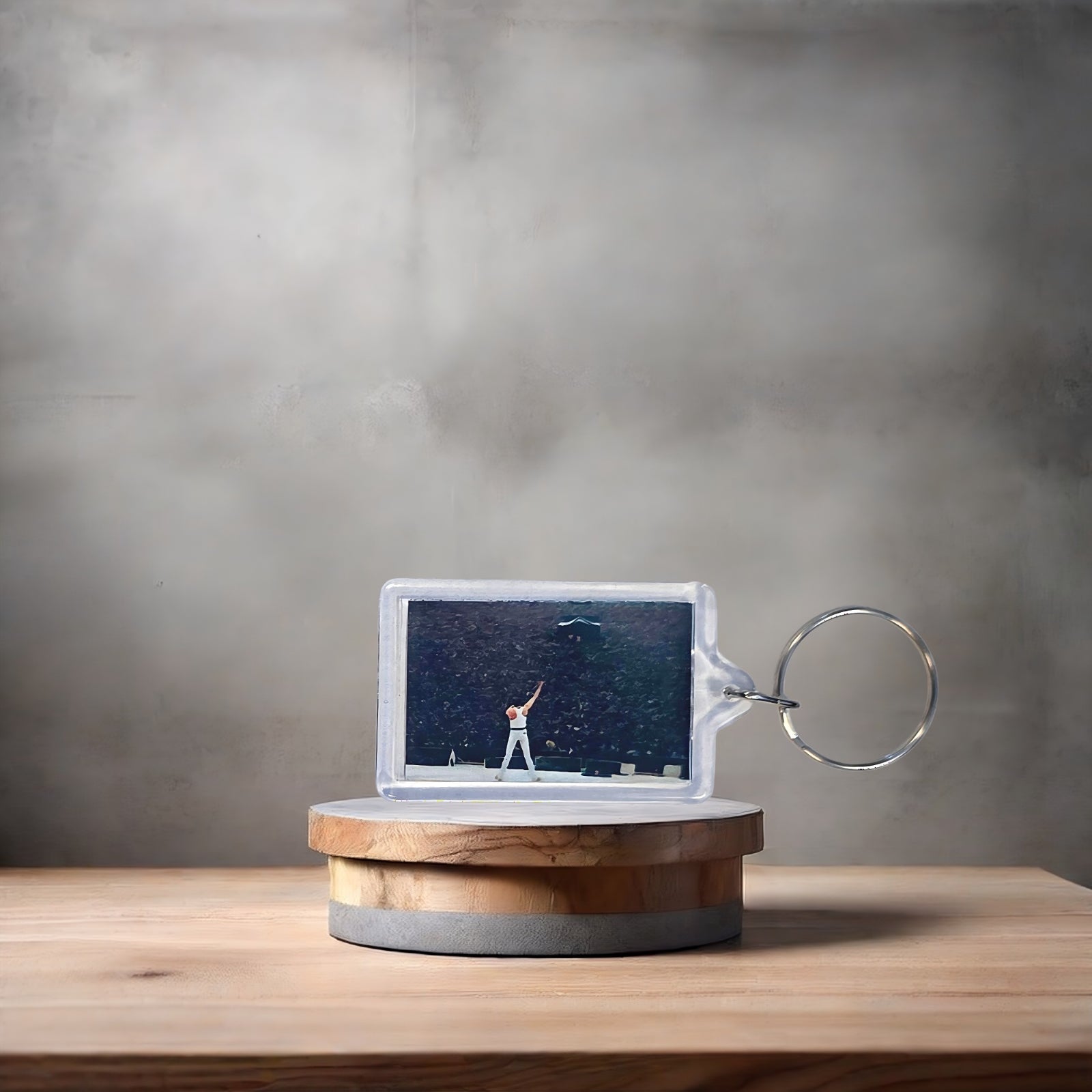 Queen Live Aid poster keychain with metal prints encased. Plenty to choose from